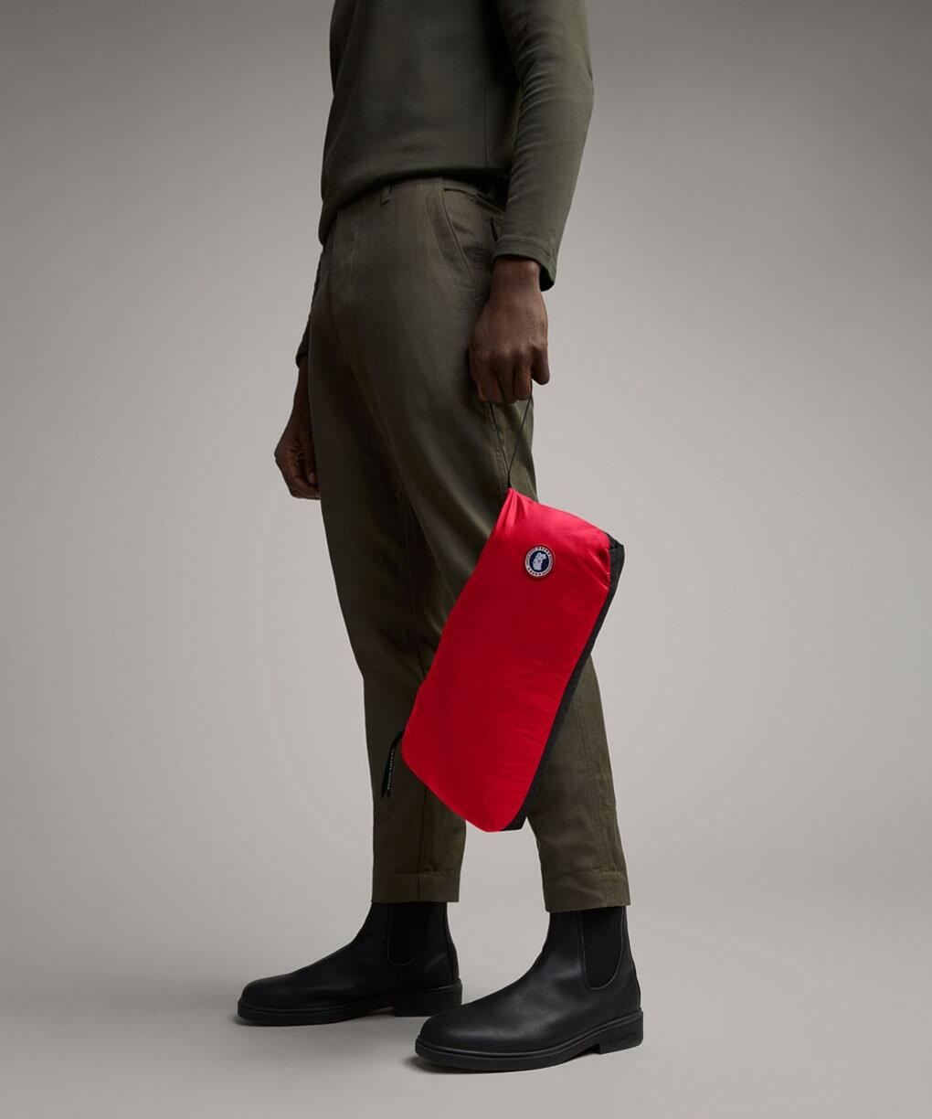 一つ上のメンズコーデと同様にダークトーンに差し色を入れたメンズコーデ。ホワイトよりももう少し派手な色を使いたい人はレッドが良いでしょう。カナダグースのロゴの赤とマッチして合わせやすいですよ。