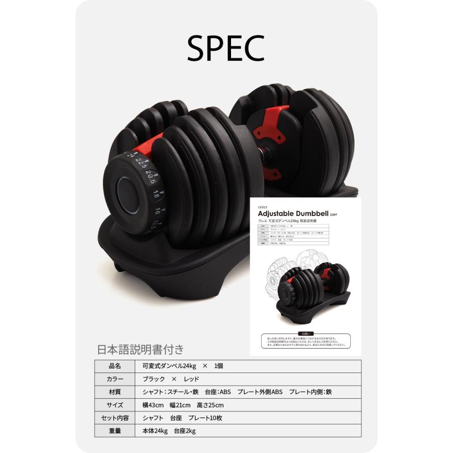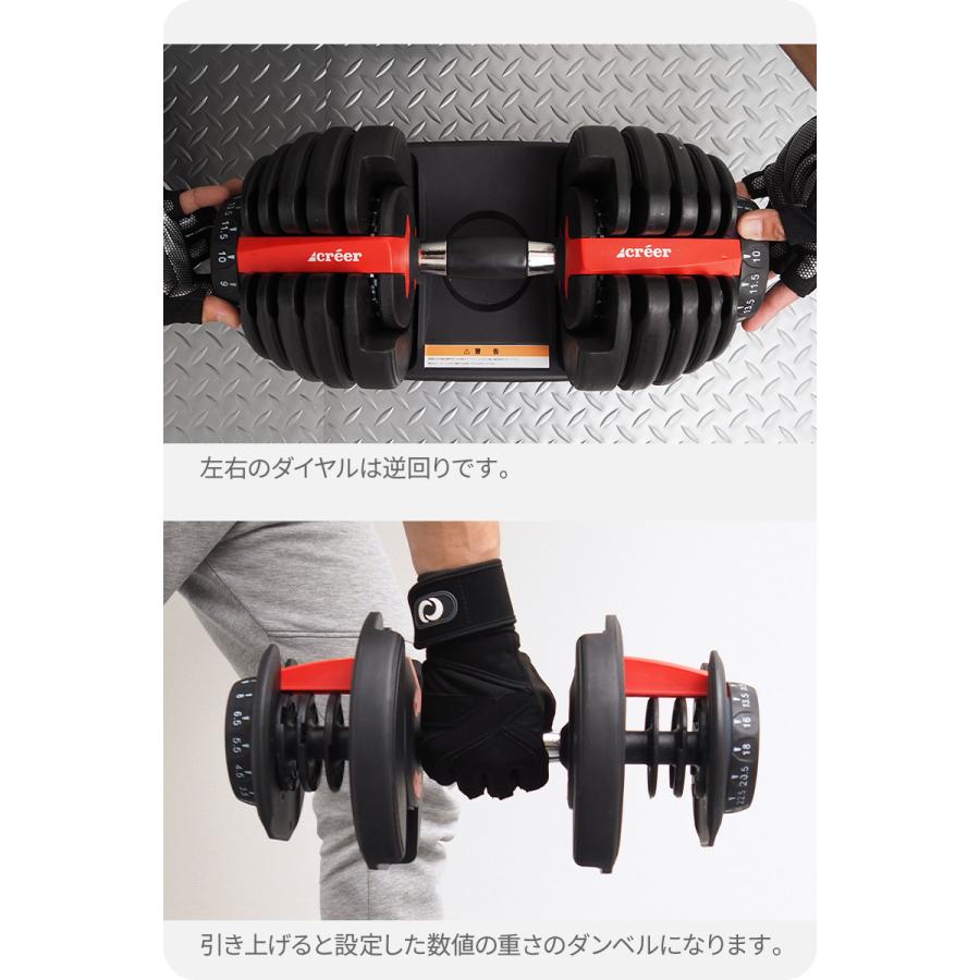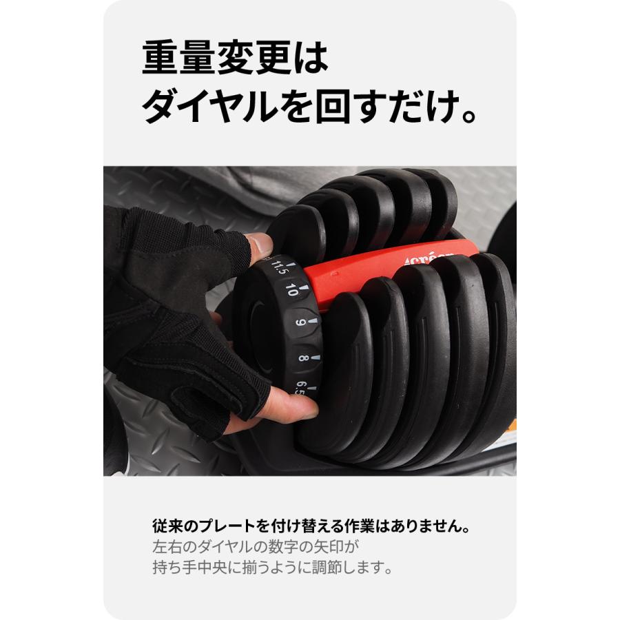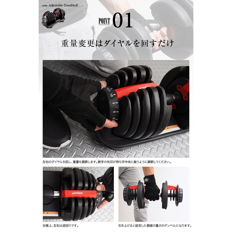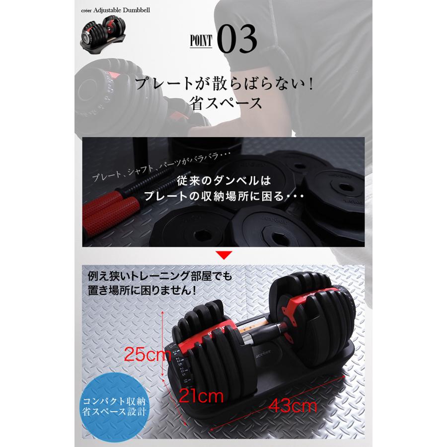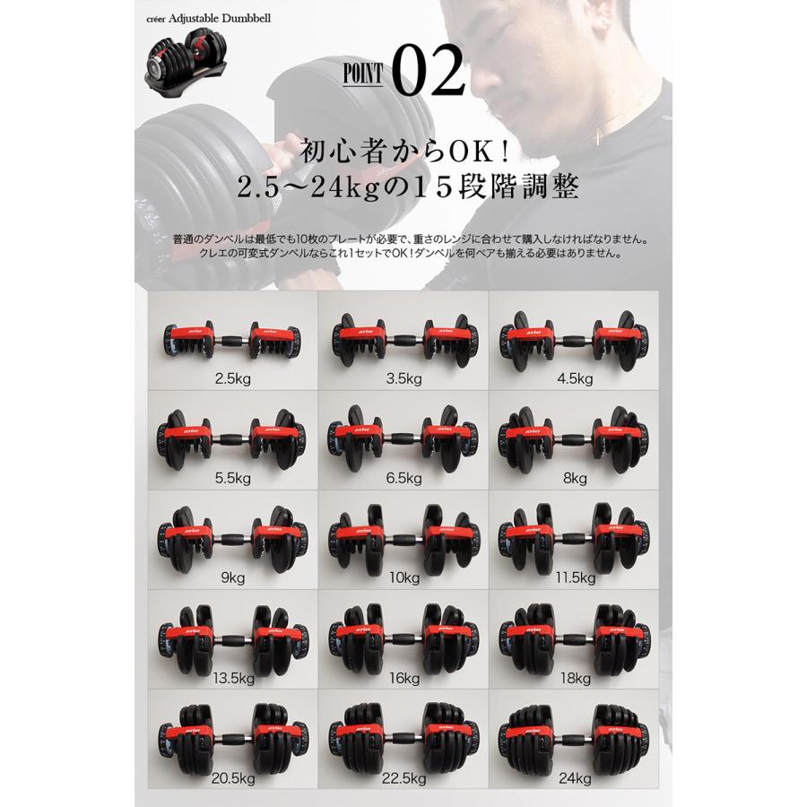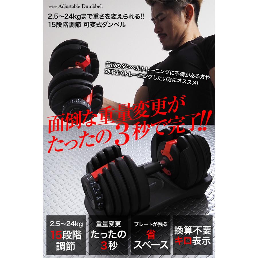 ライズの可変式ダンベルはダイヤル式となっているのでプレートの付け替えを行う必要が無く、なんと3秒で重量を変更することができます。2.5~24kgまで15段階の切り替えが可能なので、一つのダンベルを家族で使いまわすこともできます。重量を変更した後はプレートがその場に残り省スペースなので、邪魔にならないのも魅力です。nnなお、重さの表示はポンドではなくキログラムとなっているので、単位を返還する手間も要りません。グリップは日本人の手に合わせた30ミリとなっており、握りやすいのも嬉しいポイントと言えるでしょう。軽めのエクササイズから、本格的なトレーニングにまで使える一本です。