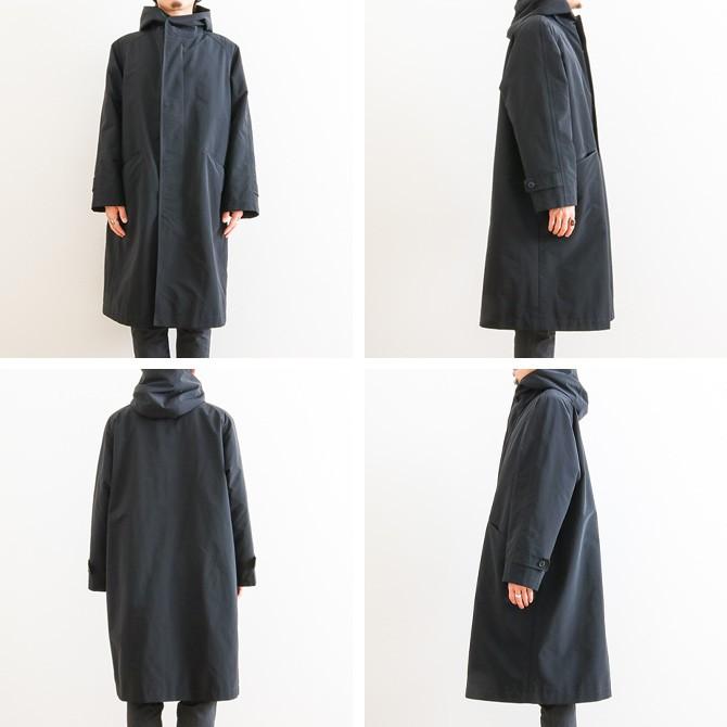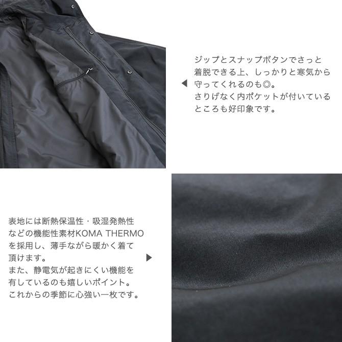 トレンドのオーバーサイズシルエットに仕立てたフード付きコート。表地は、断熱保温性、吸湿発熱といった特徴を持つコマサーモ素材を採用しています。薄くて軽いのにとても暖かいので、たくさん着こむ冬や、肌寒い日にサッと羽織れる春から秋にもおすすめしたいコートです。nn都会的な印象のラグランスリーブで、おしゃれさと動きやすさが両立されています。また、フロント部は、ファスナーとスナップボタンが両方ついている安心構造であることも魅力の1つです。