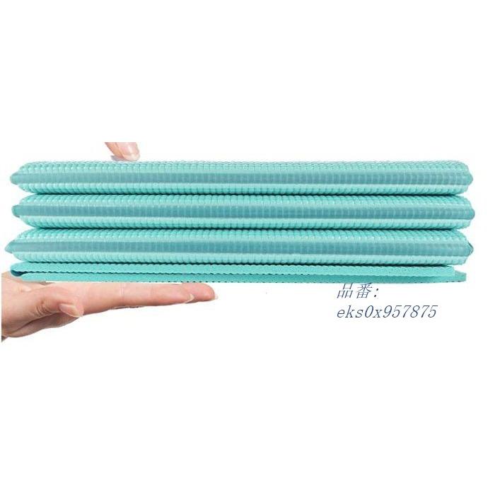 ヨガマットには便利な折りたたみ式のものもあり、一般的なヨガマットは片づける時に丸める場合が多いですが、画像のようにコンパクトにできます。折りたためるヨガマットの中にはあらかじめ折り目がついているタイプもあるので、すぐに片づけたい方は重宝します。ヨガをしないときは片づけておきたいといった人や、持ち運びしたい方にはもってこいの商品です。