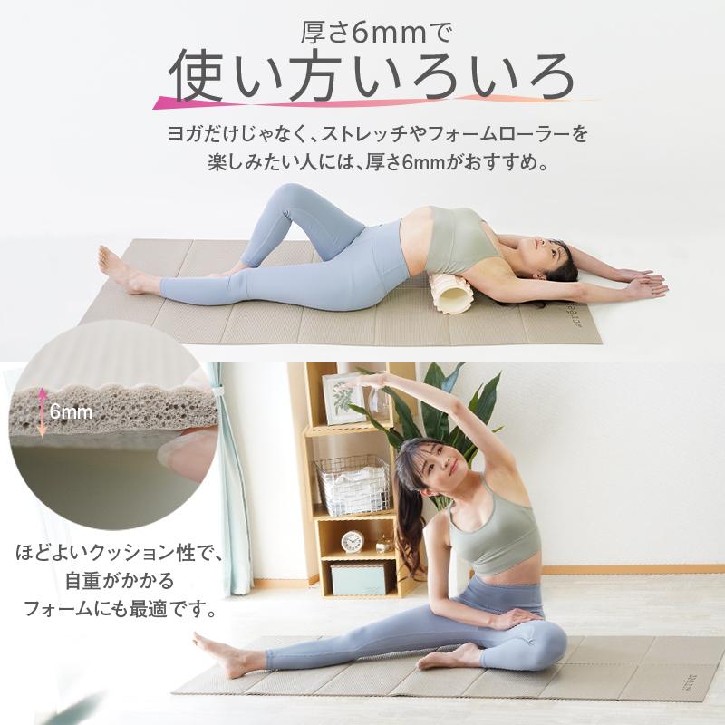 ヨガをしたときに背中が痛くなることもあるため、ヨガマットは厚みも重要なチェックポイントとなります。また、メリットでもある折りたたみ式ヨガマットの折り目ですが、ヨガ中に体に当たって気になる場合もあるので注意してください。