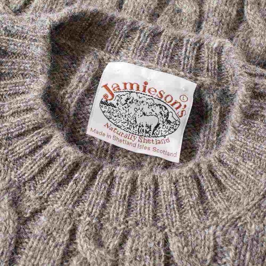 ジャミーソンズは、シェットランドウールというスコットランド北のシェットランド諸島の羊から採れるウールに特化して生産しているブランドです。伝統の草木染めをしていることで知られており、多色使いをしたフェアアイル柄が特長になります。今回のクルーネックセーターはとてもシンプルなケーブル編みのアイテムです。nnケーブルのみのシンプルでスタンダードな1着になります。このブランドの特長であるシェットランドウールが使用されているので軽く暖かく、着心地抜群。素材にまでこだわりたい方や、ニットの生産が盛んな地域のブランドのアイテムが欲しい方におすすめです。