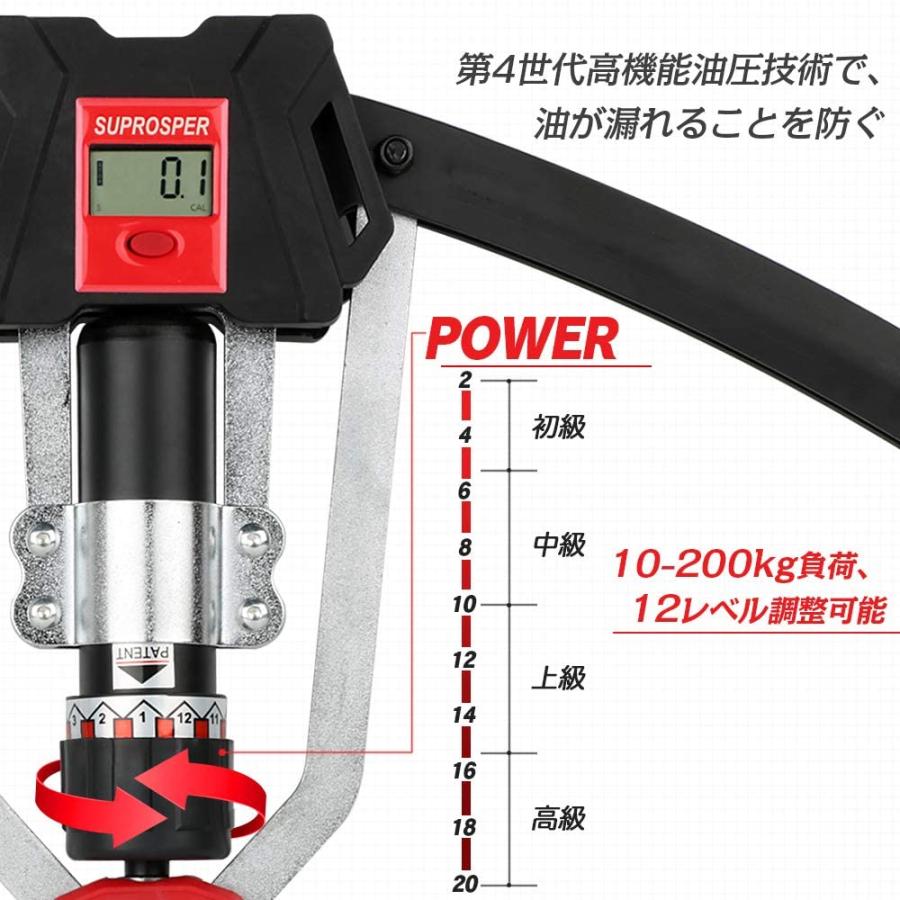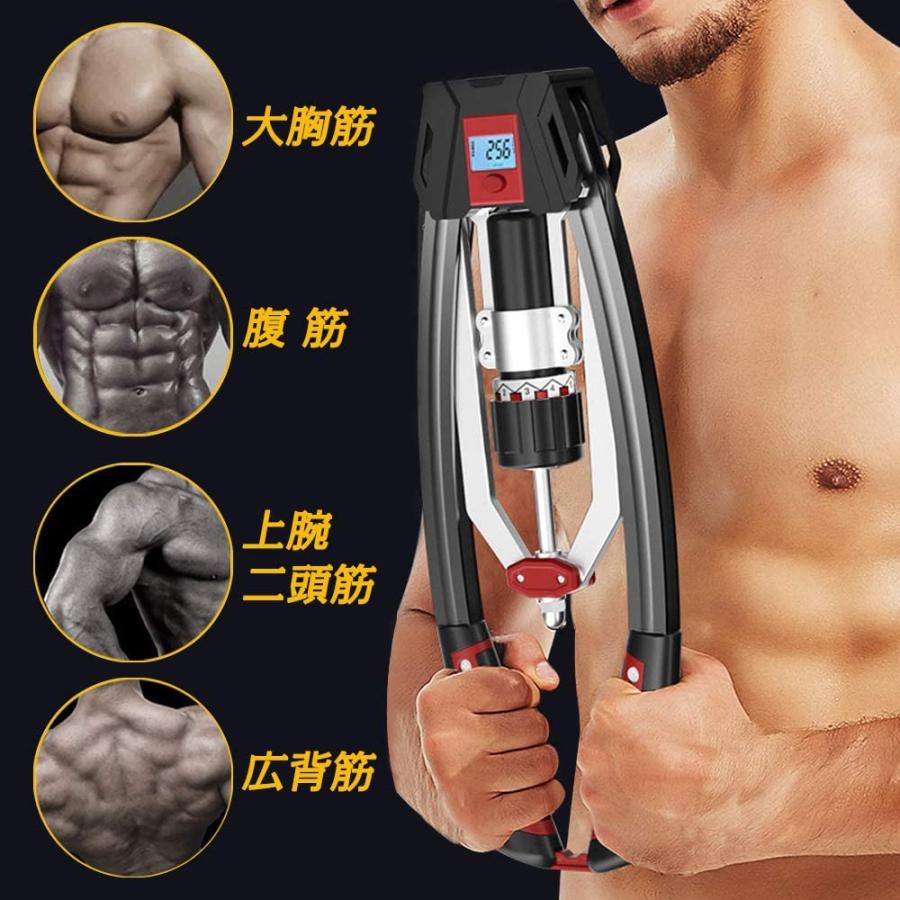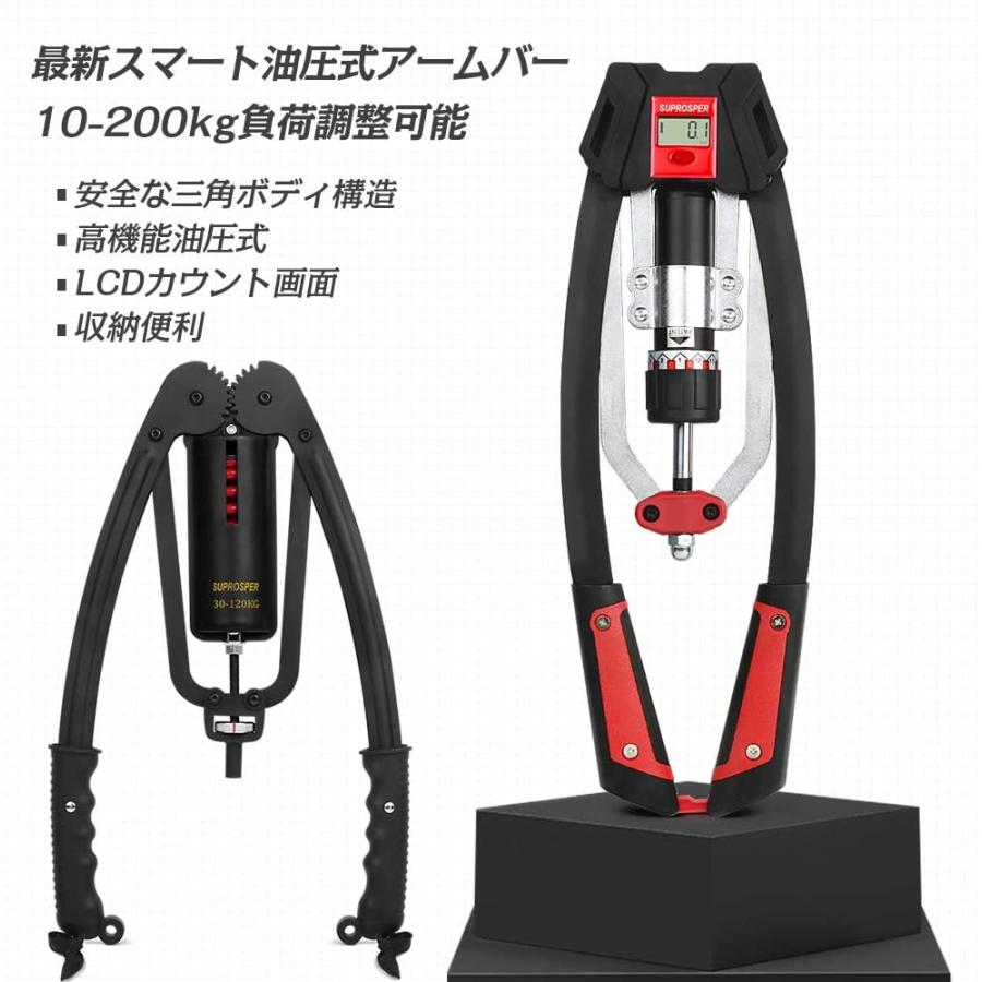 こちらの商品も10~200kgと12段階で負荷の調節が可能で、初級から上級の方まで使える油圧式アームバーとなっています。第4世代高機能油圧技術を搭載しているので、油が漏れにくい構造になっているのも特徴です。nnこのアームバーには液晶画面がついているのも大きな特徴です。画面には時間、回数、累積回数が表示されているので、トレーニングをしながら回数を数える手間もかかりません。時間を決めてトレーニングをしたいときにも便利なうえ、累積回数をチェックすればモチベーションもアップします。